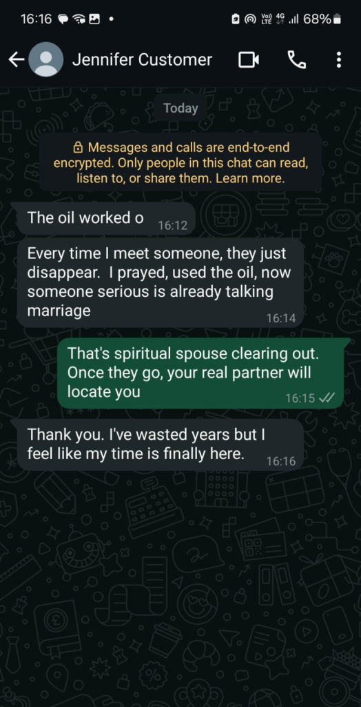 If you have been looking to attract a potential spouse without success or your marriage is shaking because of outside forces; use this oil and win the heart of your spouse.